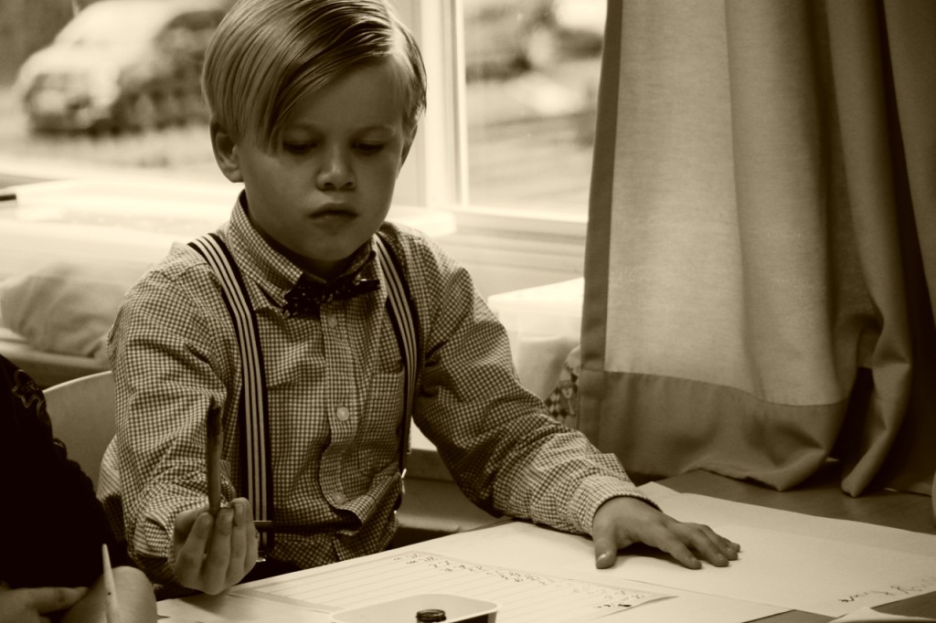 ein Junge in alter Schulkleidung sitzt im Unterricht; er versucht, mit der Feder zu schreiben